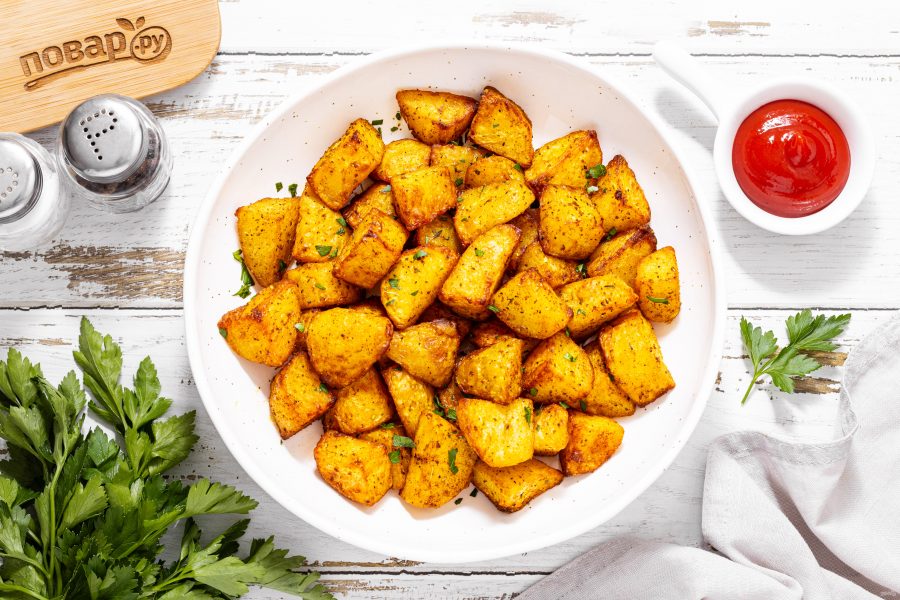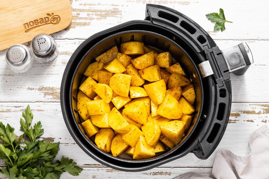 Готовьте картошку 20-25 минут при температуре 180 градусов до румяного цвета. Пару раз открывайте аэрогриль и перемешивайте картошку для равномерного приготовления.