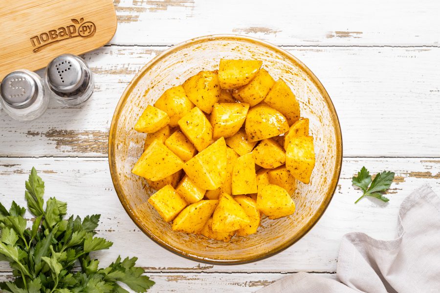 Все перемешайте, чтобы каждый ломтик был покрыт маслом со специями.