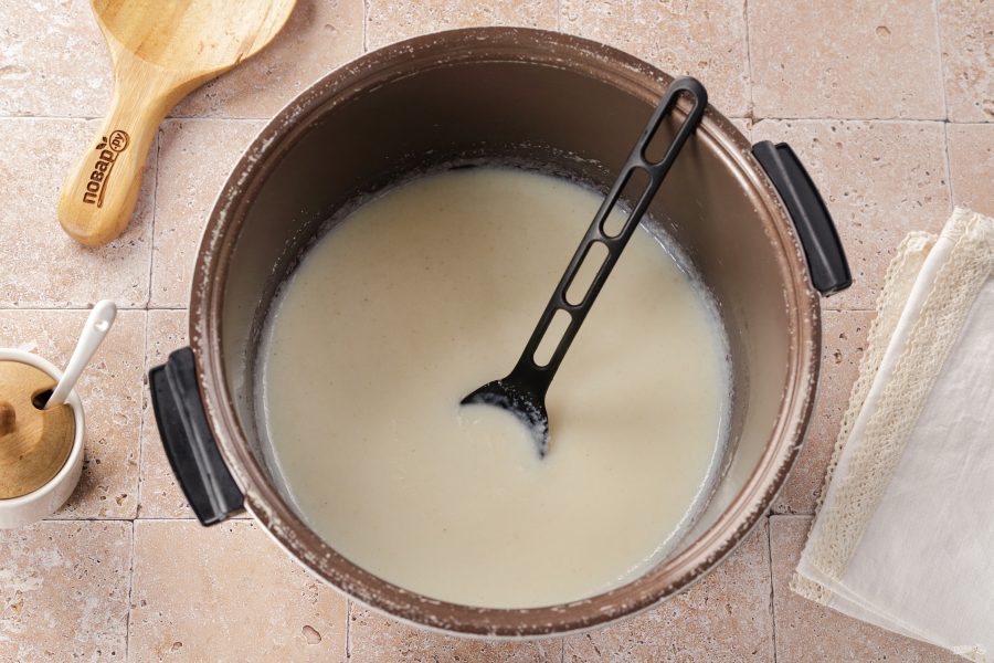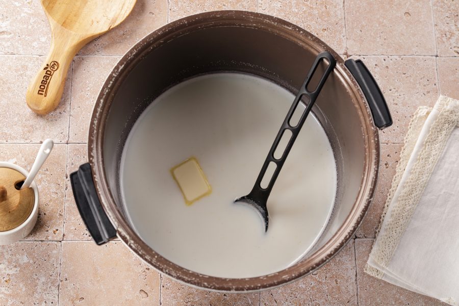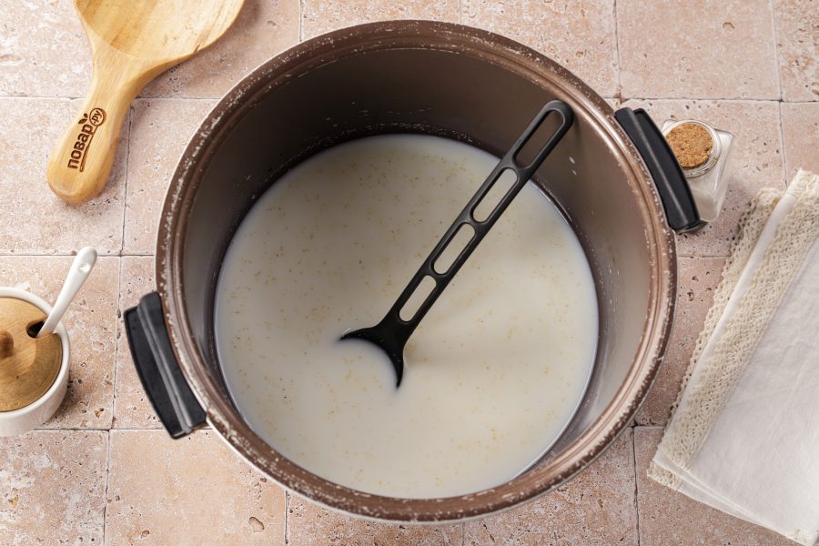Налейте в чашу мультиварки воду и молоко.