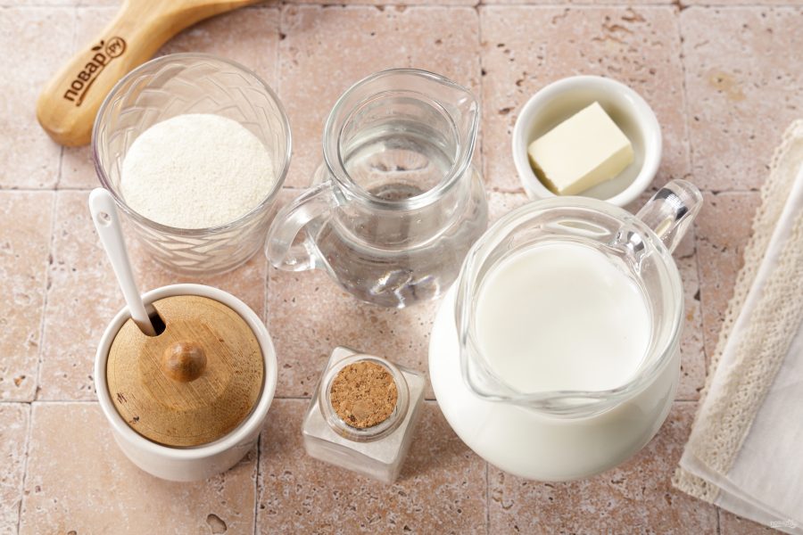 Подготовьте все ингредиенты по списку. Я буду готовить кашу на молоке и воде, но можно использовать только молоко. Количество сахара регулируйте на свой вкус.