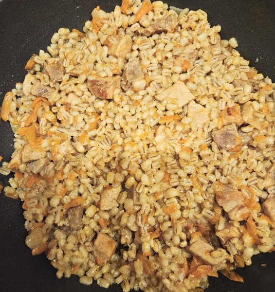 После добавляем овощи и мясо к перловой каше и настаиваем в течение 20 минут, приятного аппетита!