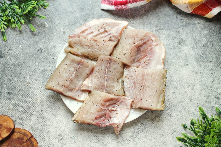 Каждый кусок кефали посолите и поперчите. При желании можно полить лимонным соком, но это может сделать рыбу более сухой.