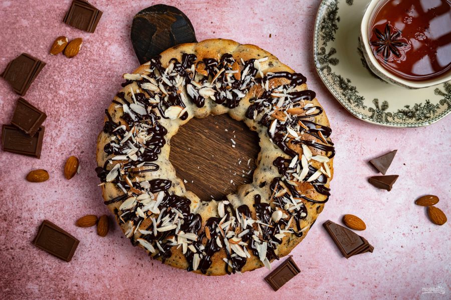 Охлажденный кекс украсьте растопленным шоколадом и присыпьте мелко порубленными