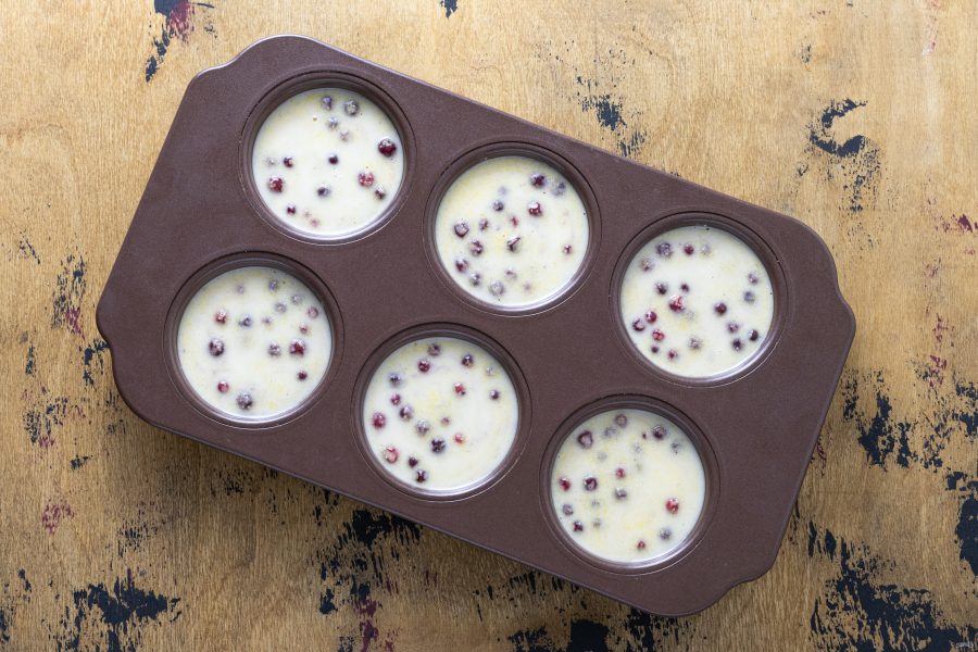 Заполните почти до самых краев форму для кексов тестом. Выпекайте кексы 30 минут. Затем убавьте температуру до 180 градусов и готовьте еще 10 минут. Готовность кексов проверяйте зубочисткой.