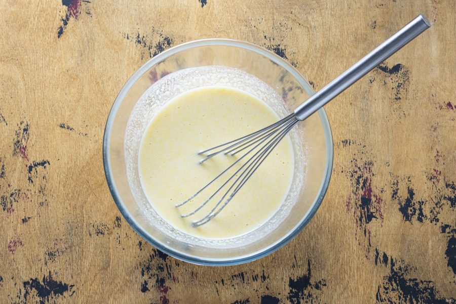 Затем влейте воду. Хорошо перемешайте, чтобы не оставалось комочков. Тесто получается достаточно жидким по консистенции.