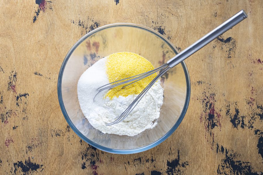 В большой глубокой миске смешайте муку, поленту, разрыхлитель, соль, сахар и щепотку ванилина.