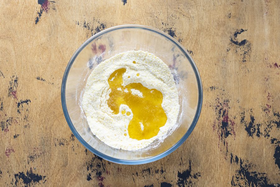 Влейте в миску растительное масло. Перемешайте вилкой до состояния мокрой крошки.