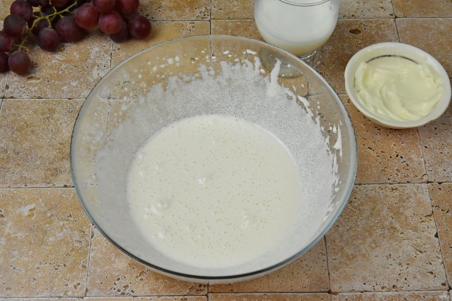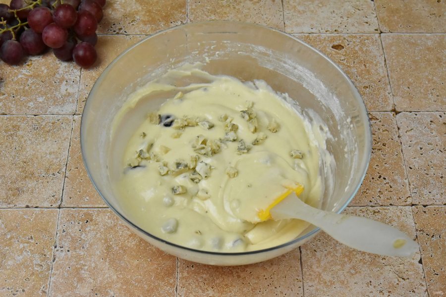 Добавьте в подготовленное тесто виноград и сыр. Перемешайте. Накройте емкость с тестом пищевой пленкой и поставьте в холодильник. Оставьте тесто на 2-3 часа или на ночь.