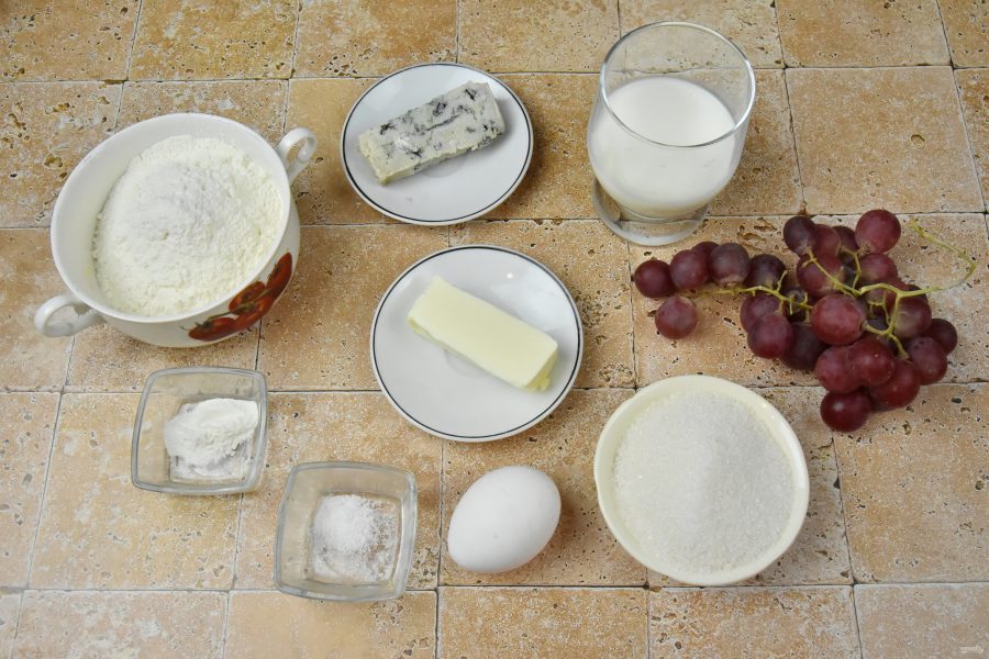 Для выпечки используйте красный виноград без косточек. Если в ягодах имеются косточки, удалите их, предварительно разрезав ягоду пополам. Можно предварительно подвялить виноград, чтобы после выпечки виноград сохранил структуру и был менее водянистым. Сыр дор блю можно заменить горгонзолой.Состав / Ингредиенты: