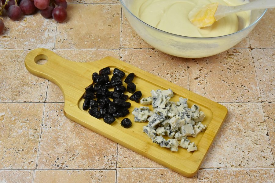 Подготовьте виноград. Если ягода крупная, разрежьте пополам. Перед добавлением в тесто обязательно просушите виноград на бумажном полотенце. Раскрошите сыр с плесенью.