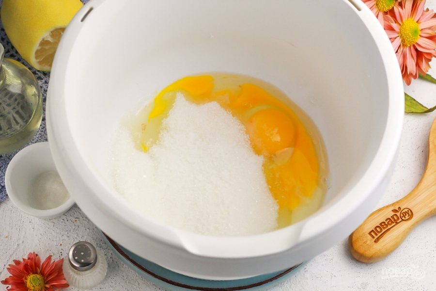 Куриные яйца вбейте в емкость миксера или кухонного комбайна, всыпьте сахар и соль, взбейте все в течение 3-4 минут, но не более, чтобы не расслоить массу.