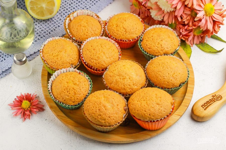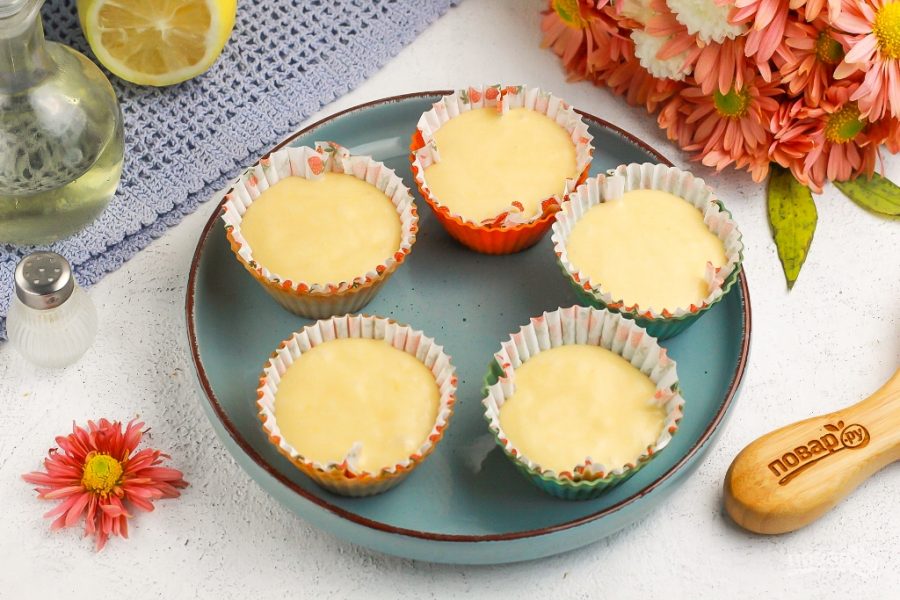 Выложите бумажные обертки в силиконовые или металлические формочки, влейте в каждую из них тесто, заполняя на две трети. Поместите формочки на противень, а противень — в духовку на средний ярус.