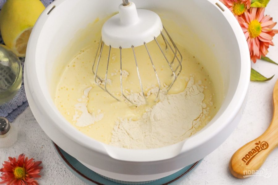 Влейте молоко любой жирности и перемешайте. Всыпьте разрыхлитель и пшеничную муку по частям, вмешайте их в массу, но не взбивайте. Разогрейте духовку до 180 градусов.
