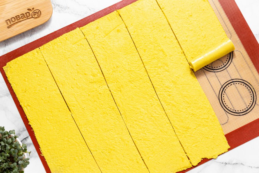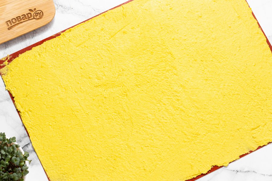 Распределите смесь очень тонким слоем ножом или кондитерским штапелем. Работать нужно быстро, смесь достаточно быстро начинает застывать. Оставьте на 15-30 минут.