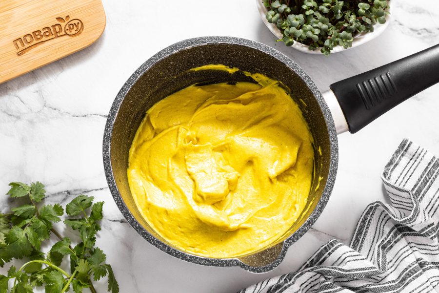 Перелейте получившуюся смесь в кастрюлю с толстым дном. На среднем огне, постоянно помешивая, доведите до кипения. Проварите еще 5-7 минут на умеренном огне. Смесь должна легко отходить от стенок кастрюли, если перемешиваете силиконовой лопаткой.
