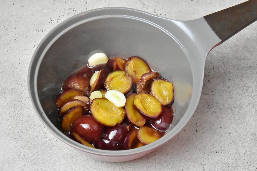 Влейте немного воды в сотейник и поставьте на средний огонь. Доведите до кипения, накройте посуду крышкой и варите сливы до мягкости 7-10 минут.