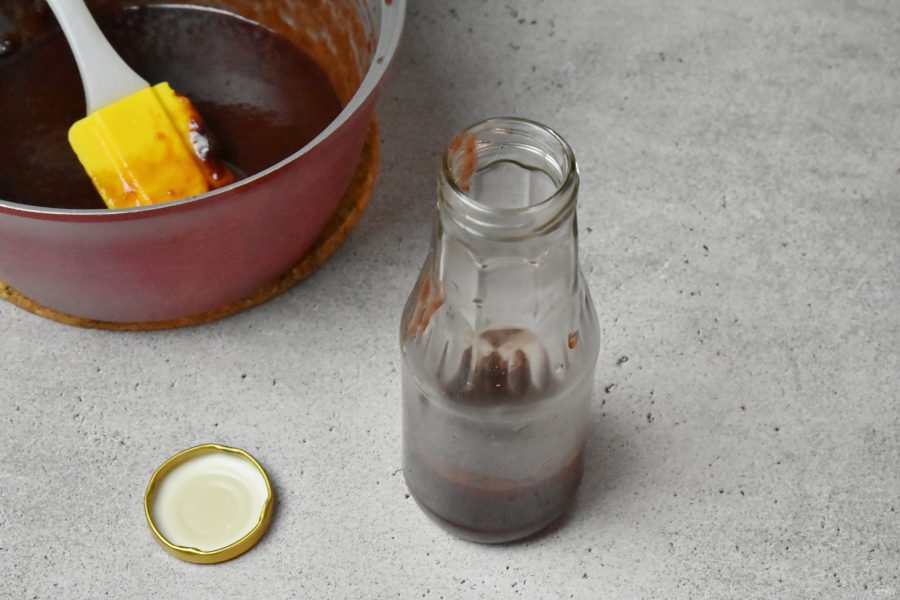 Подготовьте стеклянную посуду. Если планируете заготовку соуса на зиму, простерилизуйте посуду и крышки любым доступным способом. Разлейте горячий соус по баночкам (бутылочкам) и герметично закройте крышками.