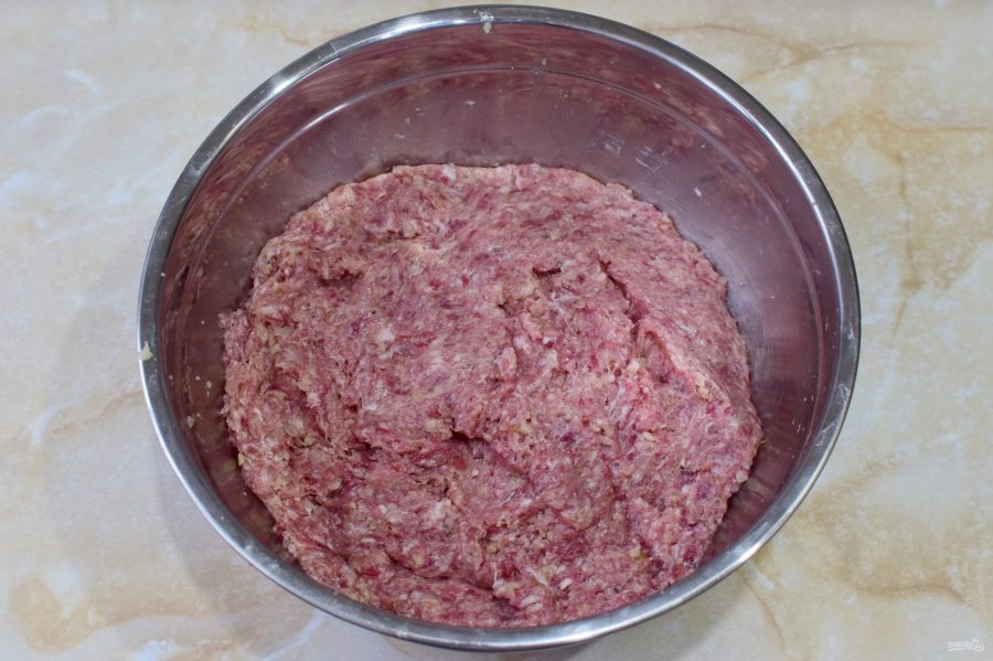 Все ингредиенты тщательно перемешайте между собой. Затем мясную массу отбейте о дно чаши, чтобы она стала плотнее. Благодаря этому котлеты не будут разваливаться при жарке.