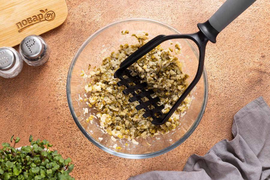 Подавите маш вилкой или толкушкой. Не нужно измельчать маш совсем в однородное пюре, оставьте текстуру с крупными кусочками.
