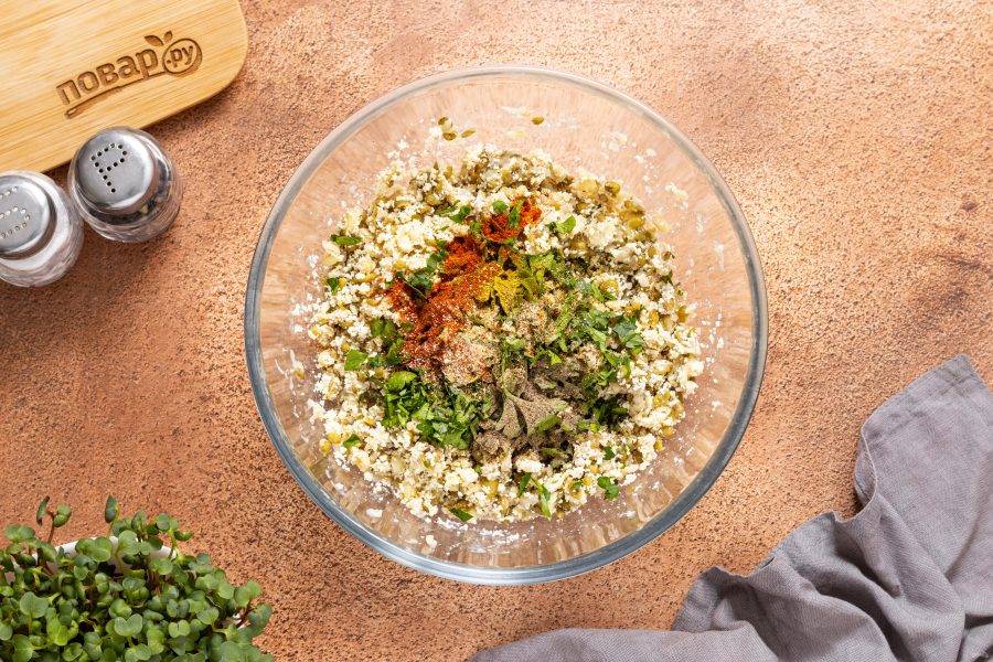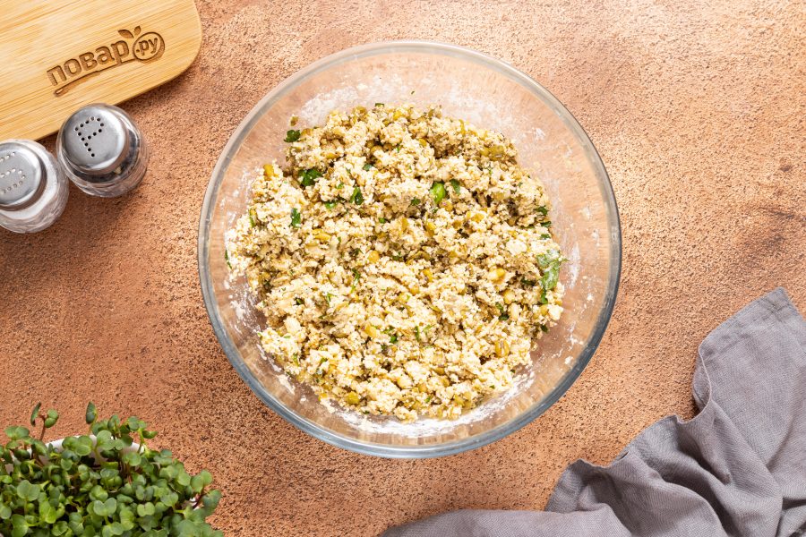 Добавьте мелко нарезанную петрушку, соль и все специи. Перемешайте. Попробуйте смесь на вкус, если устраивает, то добавьте крахмал и муку.
