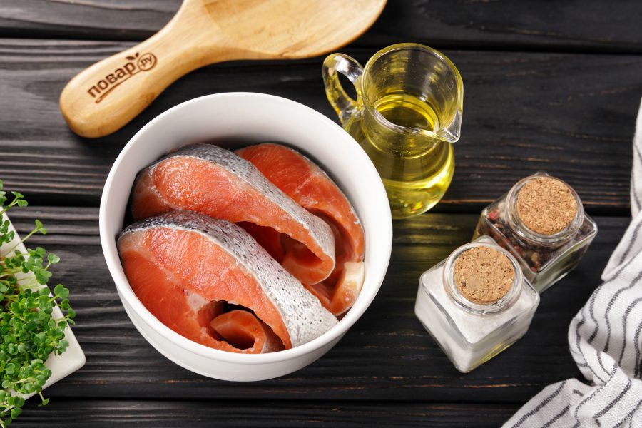 Подготовьте все ингредиенты по списку. Рыба подойдет любая — лосось, сёмга, кета, горбуша, у меня форель. Возьмите готовые стейки или филе. Или разделайте целую рыбу сами.