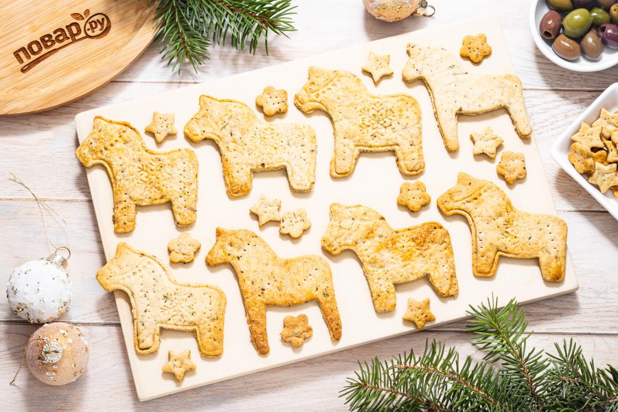 В качестве альтернативы хлебу на новогодний стол можно приготовить соленые крекеры в форме лошадок. Они получаются хрустящими, рассыпчатыми и насыщенными на вкус благодаря итальянским травам.