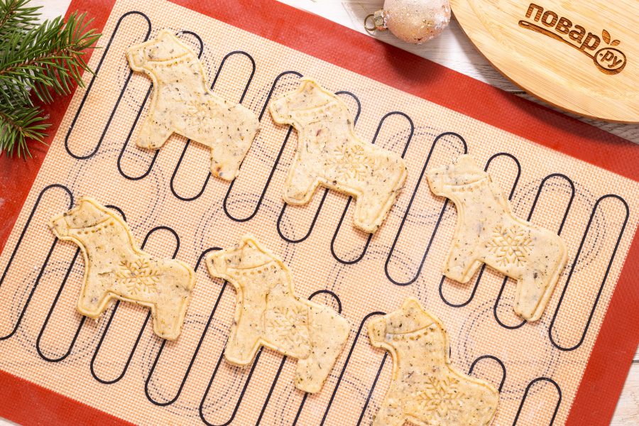 С помощью формочки для печенья вырежьте лошадок. Наколите вилкой. Обрезки соберите вместе и снова раскатайте.