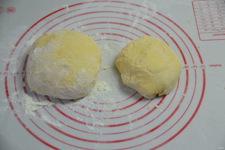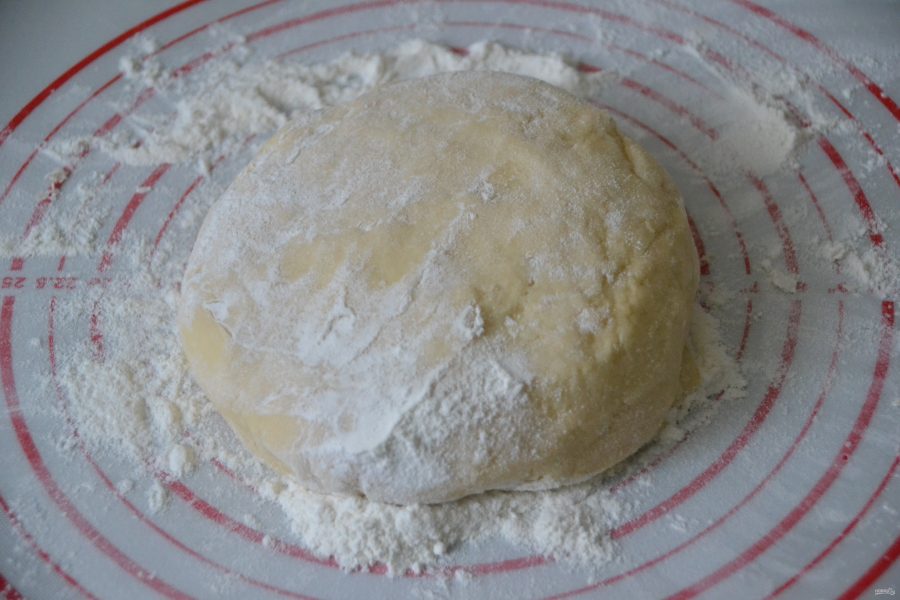 Выложите на стол, присыпанный мукой, замесите тесто. Тесто должно быть мягким, эластичным.