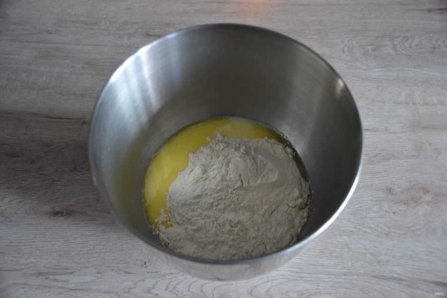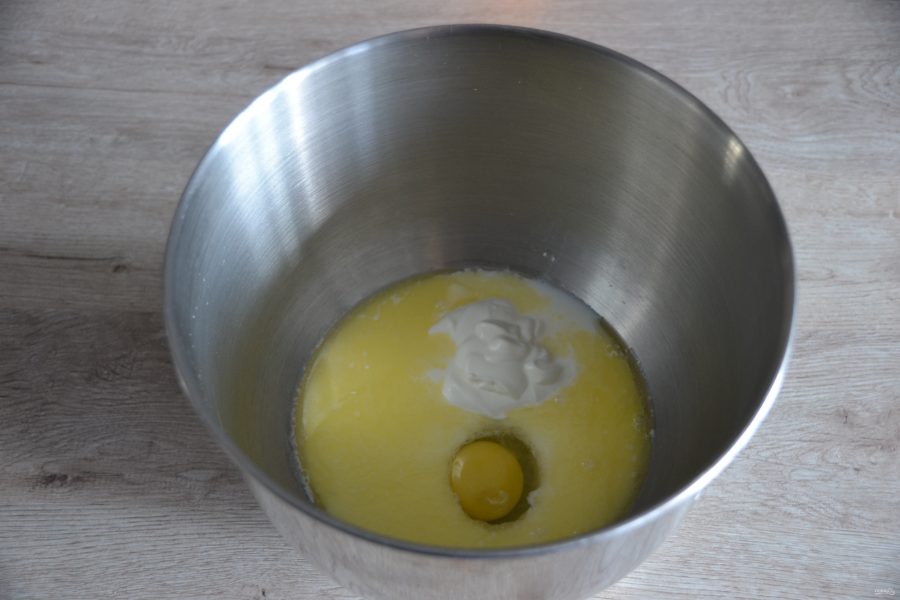Пока готовится начинка, замесите тесто. Для этого влейте в емкость для замешивания теста молоко, 30 гр. растопленного сливочного масла, вбейте яйцо, добавьте сметану, щепотку соли, 1 ст.ложку сахара.