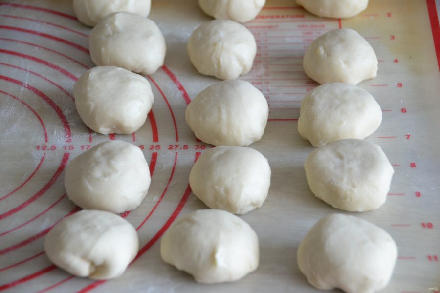 Разделите тесто на 15-16 равных частей. Подкатайте каждую часть в шар.