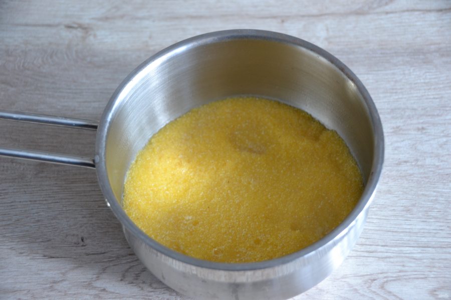 Заварите поленту "Bravolli" 150 мл. кипятка, накройте крышкой, дайте набухнуть.