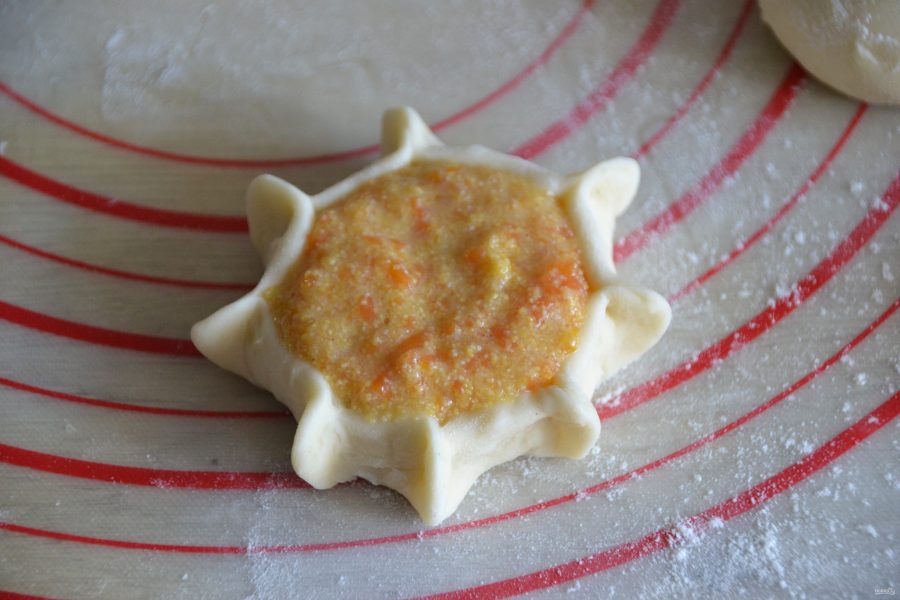 Раскатайте тесто в лепешечку, выложите начинку, сформируйте бортики с защипами.