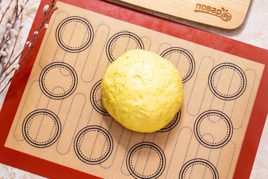 Когда тесто поднимется, обомните его и снова скатайте в шар. Выложите на рабочую поверхность, накройте пленкой и оставьте еще на 10 минут.