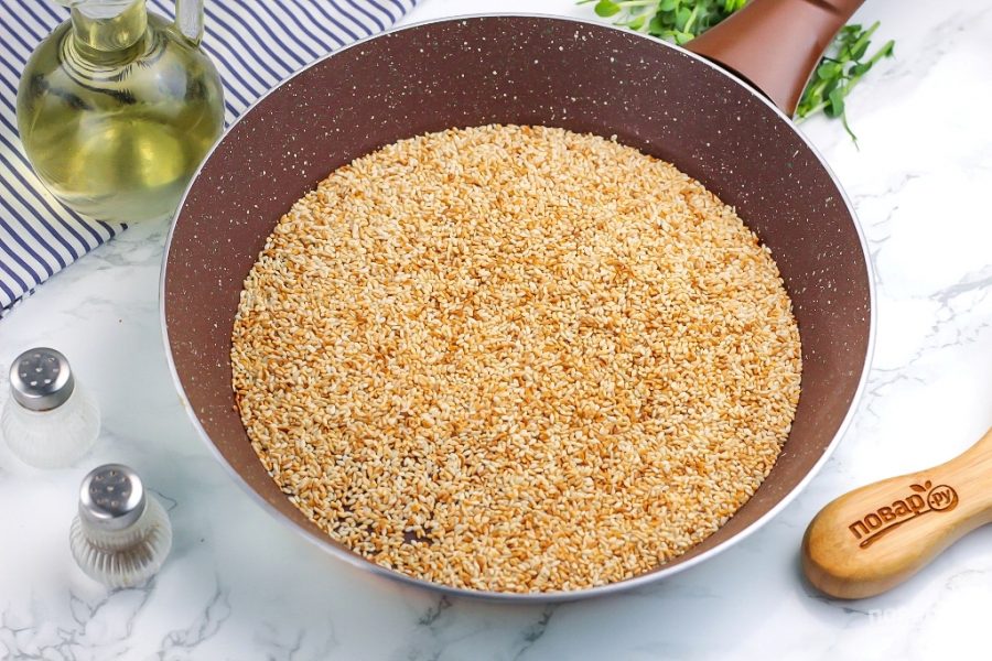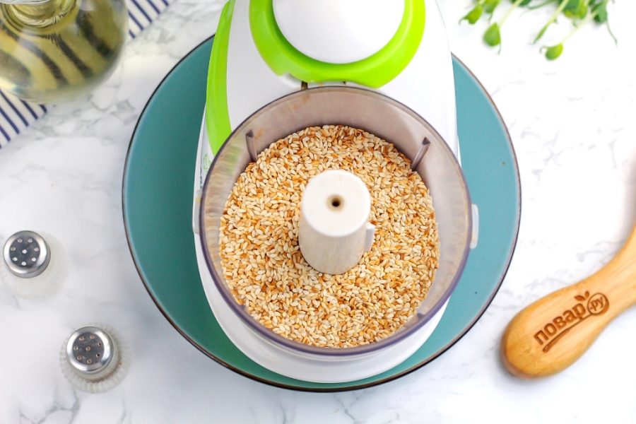 Подрумяньте их в течение 3-4 минут, обязательно перемешивая. Благодаря обжариванию, кунжут приобретет ореховый привкус. Но следите внимательно, чтобы зерна не подгорели, иначе паста приобретет горечь! После обжаривания пересыпьте кунжут на тарелку и остудите.
