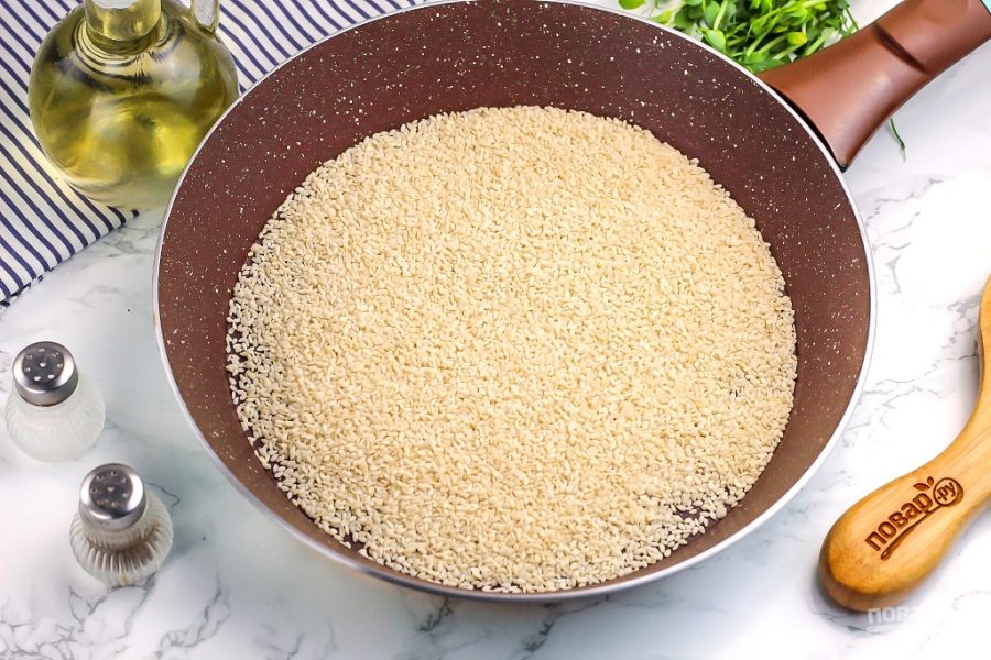 Кунжут пересыпьте в широкую сковороду с бортиками и поместите емкость на плиту, включая умеренный нагрев. Сильный нагрев не включайте, иначе зернышки быстро подгорят!