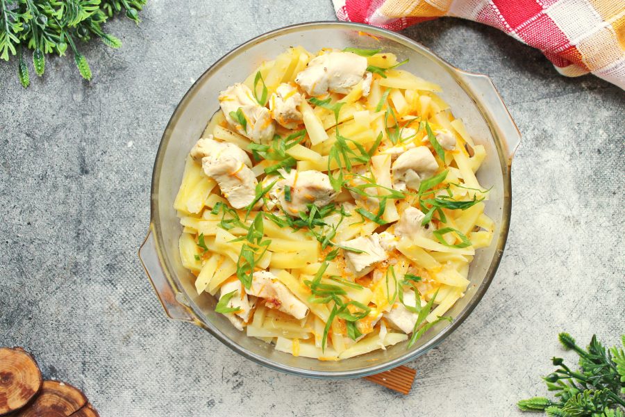 Картофель порежьте соломкой и выложите к овощам с курицей.