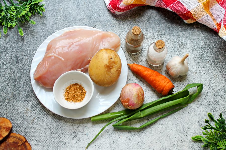 Подготовьте все необходимые ингредиенты для приготовления курицы с картошкой в микроволновке. Овощи почистите и сполосните.