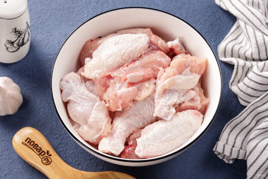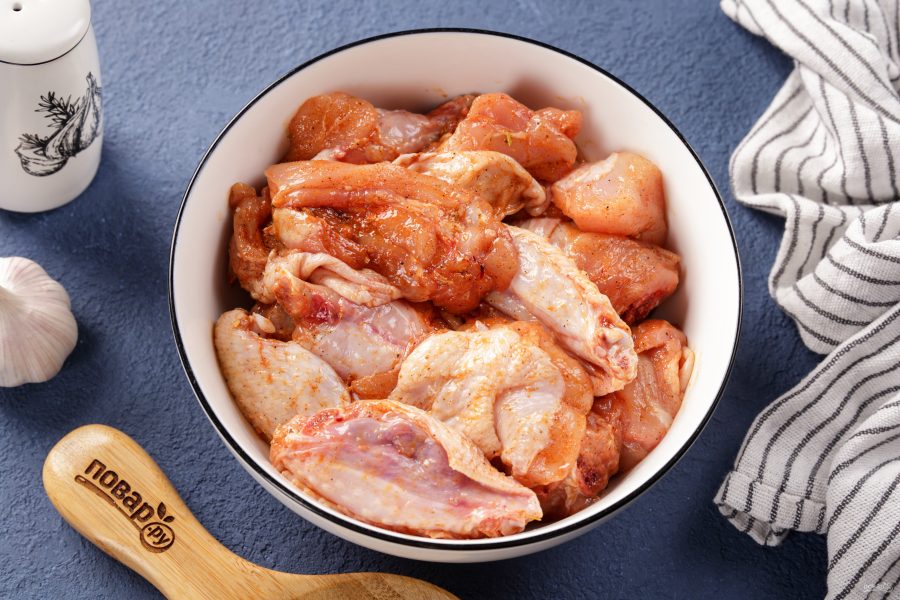 Подготовьте все ингредиенты по списку. Можете использовать любые части курицы, у меня — голень, крылья и бедро. Специи берите на свой вкус. Я беру паприку и готовую смесь для курицы.