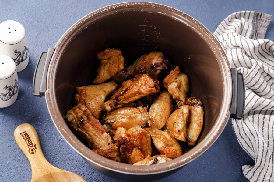 В чашу мультиварки налейте масло, разогрейте на режиме «Жарка» и выложите маринованную курицу. Обжарьте со всех сторон до лёгкой золотистой корочки. Можно обжарить курицу на сковороде на сильном огне, а потом переложить в мультиварку.