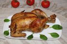 2. Помещаем курицу на специальную подставку, и запекаем в духовке при температуре 200 градусов. Если верх уже начнет стремительно румяниться, - прикроем верх курицы фольгой и продолжаем запекать, пока сок из курицы при проколе будет выделяться прозрачный, а не розоватый.