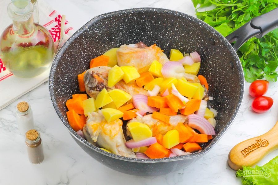 Влейте в сковороду с высокими бортиками растительное масло и выложите части курицы. Если присутствует на них кожа, то кожей вниз. Обжарьте примерно 10-15 минут до румяности на среднем нагреве, время от времени переворачивая. В это время нарежьте картофель небольшими кубиками, лук — полукольцами, морковь — по желанию. Добавьте в емкость и обжарьте еще 5-10 минут.