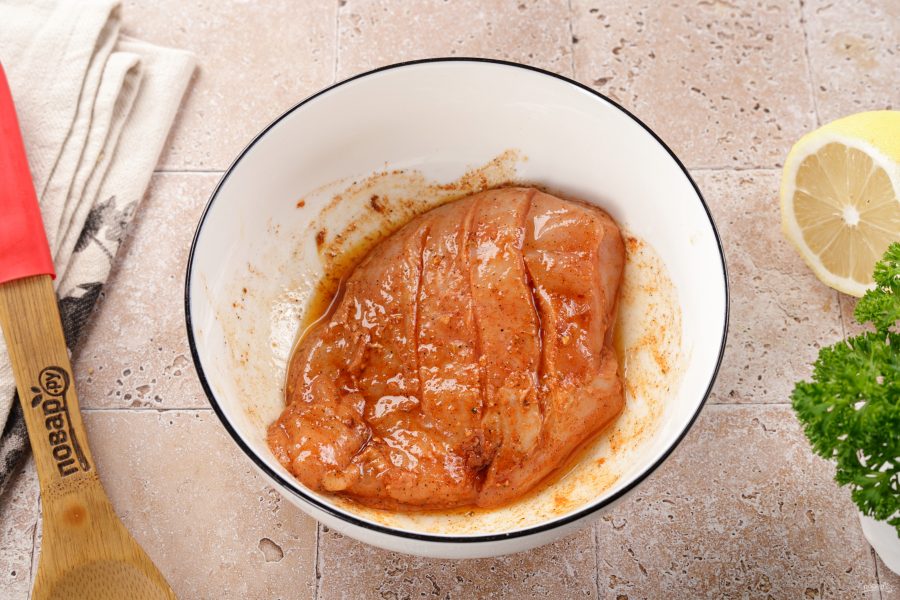 Переложите грудку в глубокую миску. Добавьте паприку, соль, молотый перец и специи на свой вкус. У меня готовая смесь для курицы.