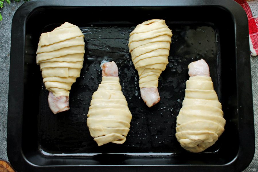 Каждую ножку плотно обверните внахлест полосками теста от низа до самого верха. Старайтесь закрыть и верх ножки.
