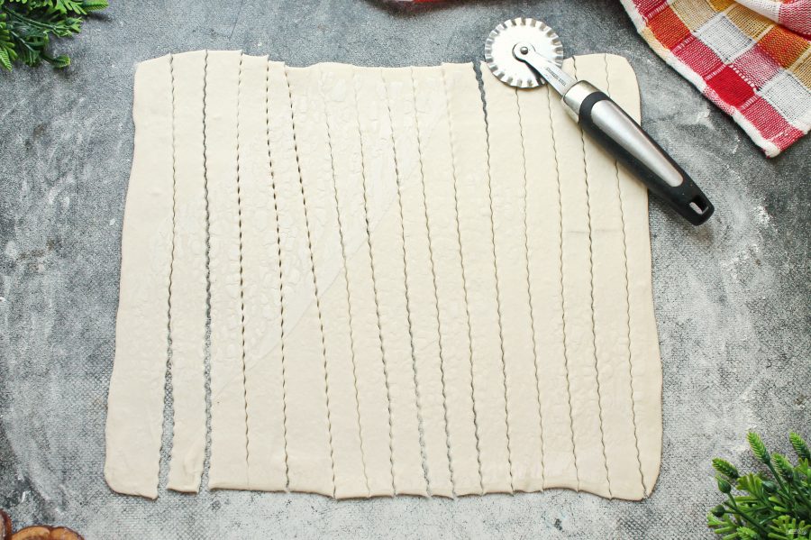 Немного посыпьте рабочую поверхность мукой. Раскатайте тесто в прямоугольник и разрежьте его полосками толщиной 1-1.5 сантиметра.