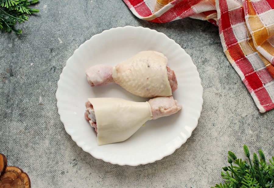 Выложите на каждую ножку по одной пластинке сыра на толстую часть и натяните кожу обратно, зафиксировав сыр внутри.