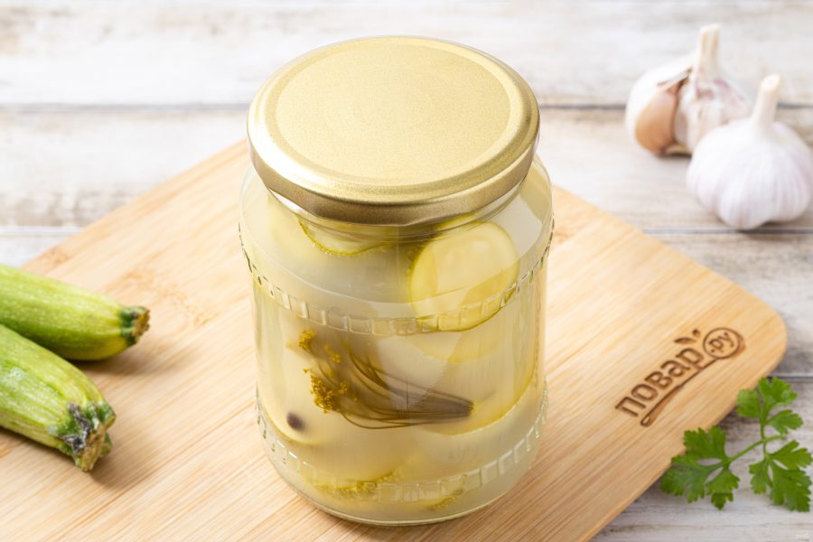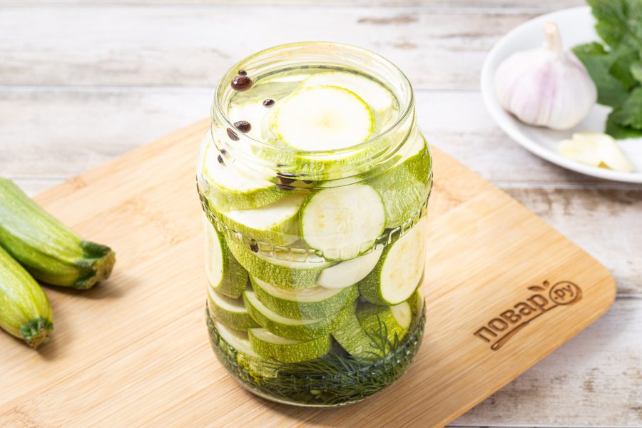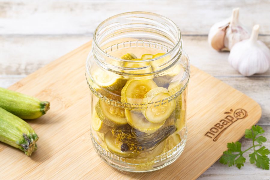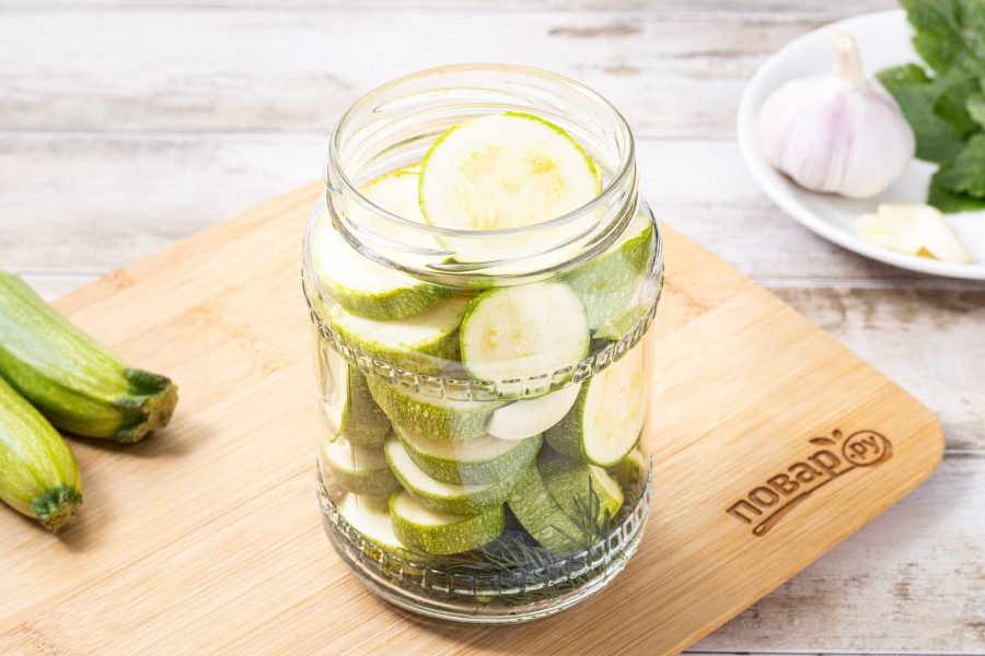 Заполните банку кабачками. Укладывать их нужно поплотнее, потому что после они все равно осядут и уменьшатся в размере.