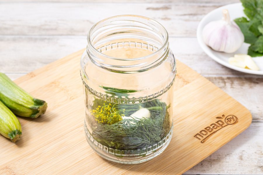 Промойте кабачки и укроп, остальную зелень уберите. Банку тоже сполосните и выложите обратно кабачки с укропом.