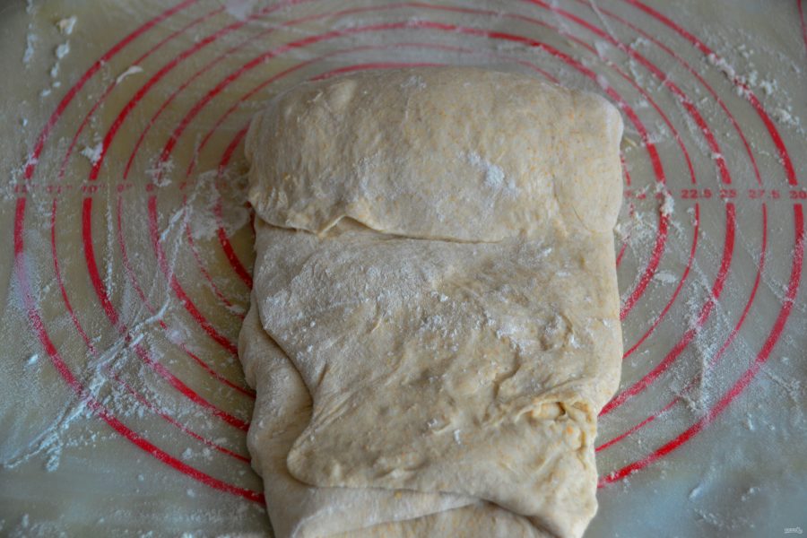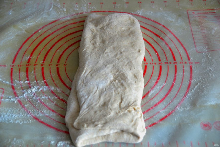Сделайте один оборот теста движением "к себе", защипните. Точно так же сделайте еще несколько оборотов, сворачивая тесто в рулет, защипывая каждый оборот.