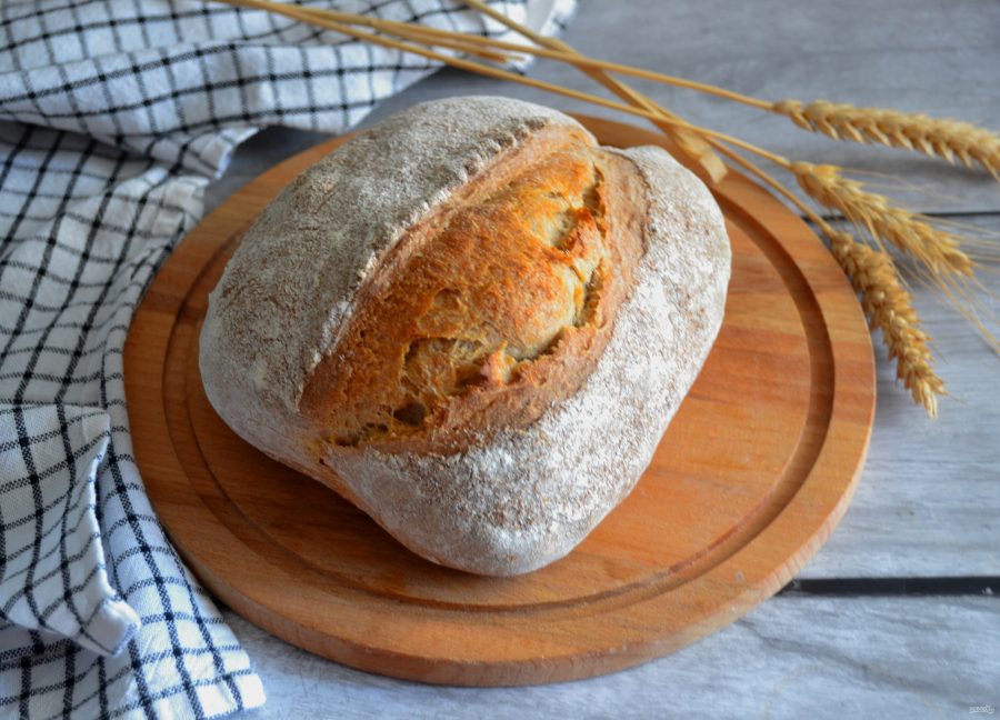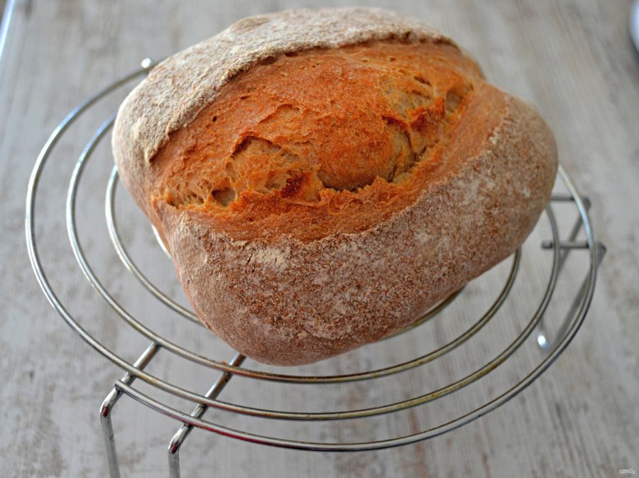 Выпекайте первые 10 минут при температуре 250 градусов, затем переключите температуре на 180 градусов и выпекайте еще 40 минут. Готовый хлеб выложите на решетку до полного остывания.