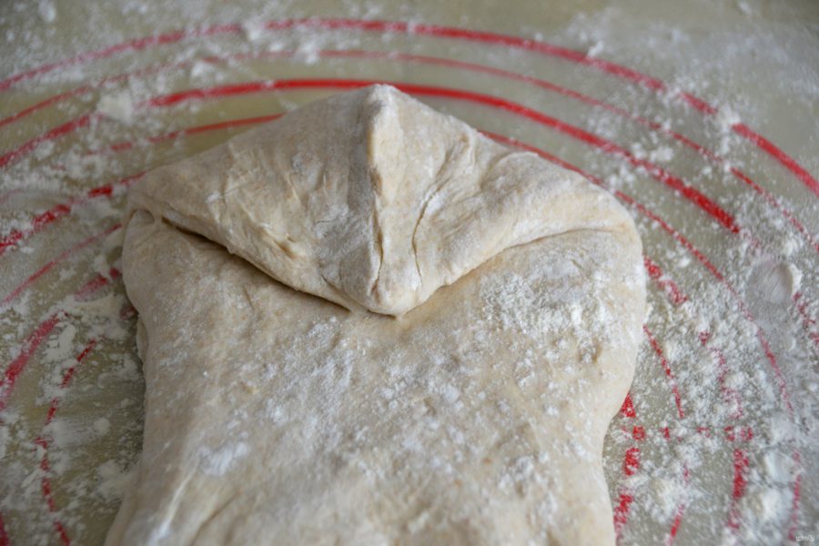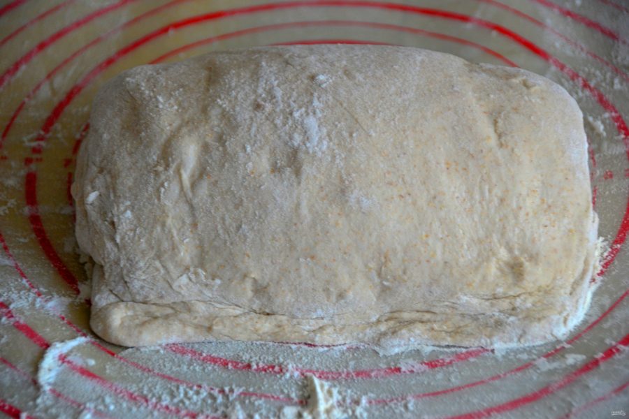 Через час сделайте первую обминку методом складывания, оставьте еще на один час. Через час снова сделайте обминку теста. Накройте тесто и оставьте для брожения еще на 1 час. В общей сложности необходимо сделать 2-3 обминки. Продолжительность брожения 3 часа.